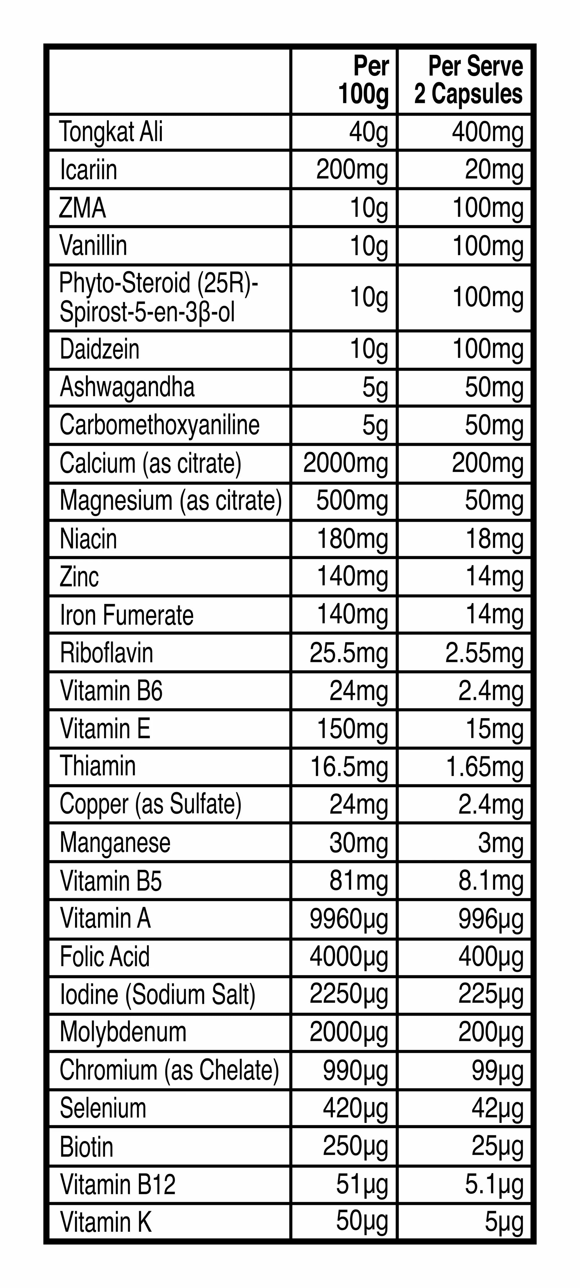 Tongkat Ali, Icarin, ZMA, Vanillin, Phyto-Steroid, (25R)-Spirost-5-en-3β-ol, Daidzein, Ashwaganda, Sucralose, Carbomethoxyaniline, Vitamin Mix: Calcium, Magnesium, Niacin, Zinc Gluconate, Ferrous Fumarate, Riboflavin, Vitamin B6, Vitamin E, Thiamine, Copper, Magnese, Vitamin B5, Vitamin A, Folic Acid, Iodine, Molybdenum, Chromium, Selenium, Biotin, Vitamin B12 and Vitamin K